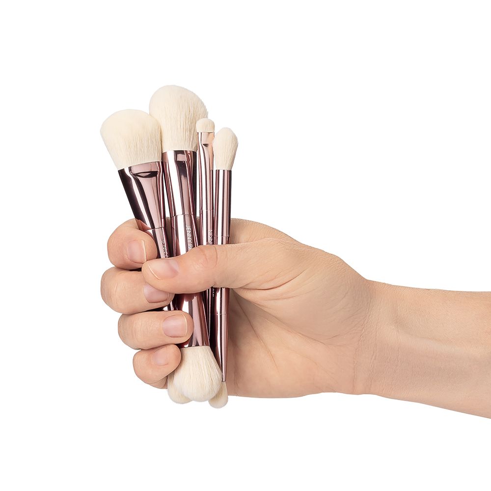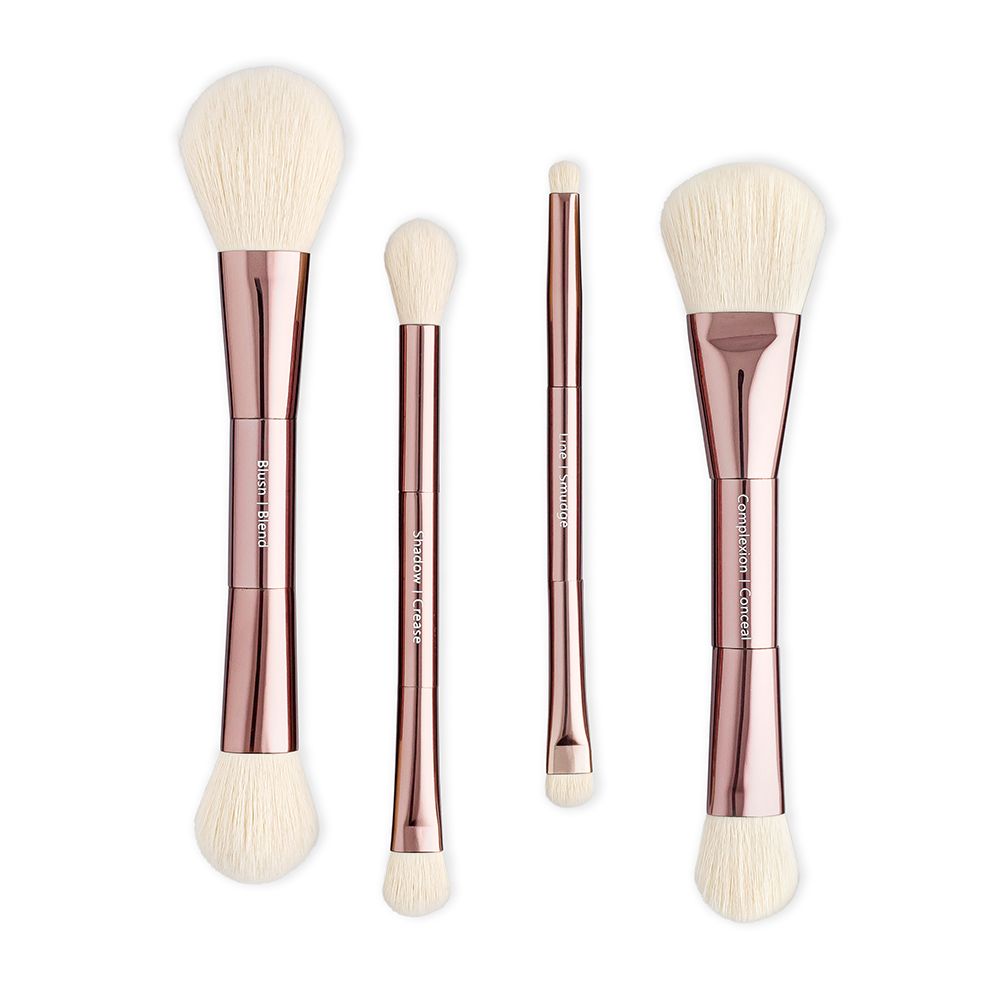 - Set of 4 travel sized dual-ended makeup brushes that can help you apply any product in your kit, no matter where you are.