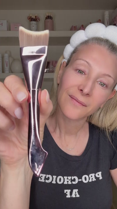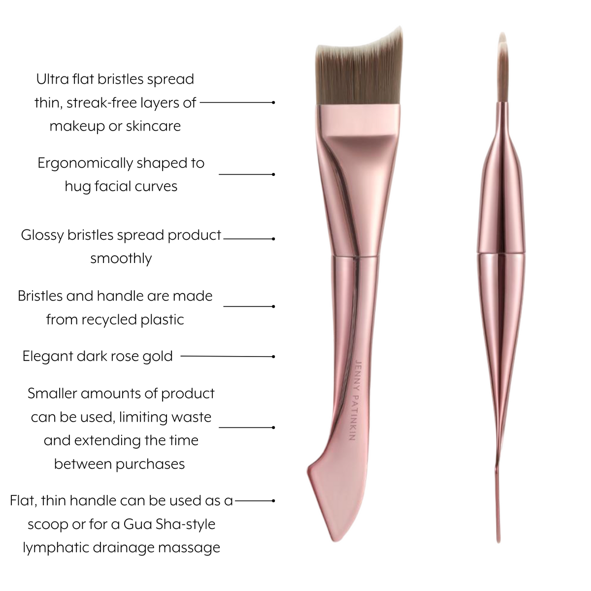 • This innovative, ergonomically shaped brush is designed to skim coat ultra thin layers of skincare and makeup.